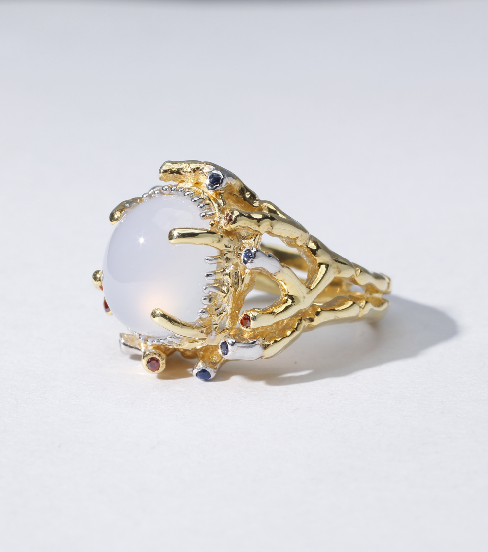 The stunning blues and red accents softly meld into the delicate sky blue hues of the chalcedony, creating a breathtaking piece that’s perfect for your special day. Whether you’re saying “I do” or attending a summer soirée, this ring is the perfect finishing touch. Pair it with light colors or whites to maintain the delicate and elegant feel of your wedding or event. Elevate your look with this timeless and charming Biedermeier Bouquet Ring in Chalcedony.