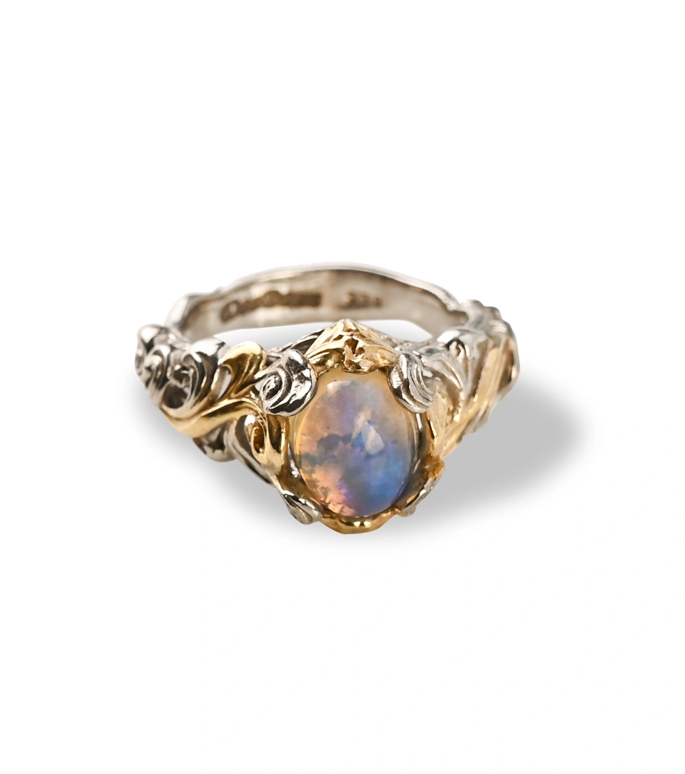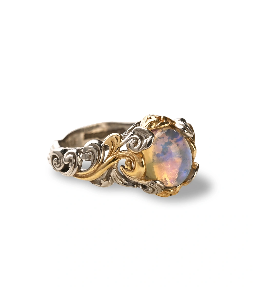 The lustrous carved waves adorned with 18Kt gold highlights elevate the royalness of the opal, creating a truly luxurious piece of jewelry. This ring is designed to complement a bohemian style, making it the perfect addition to any free-spirited, eclectic look. The Ethiopian Opal’s vibrant array of colors reflects in the light, making this ring a true solo statement piece. Embrace the beauty of Ethiopian opal with this mesmerizing Gilded Waves Ring.