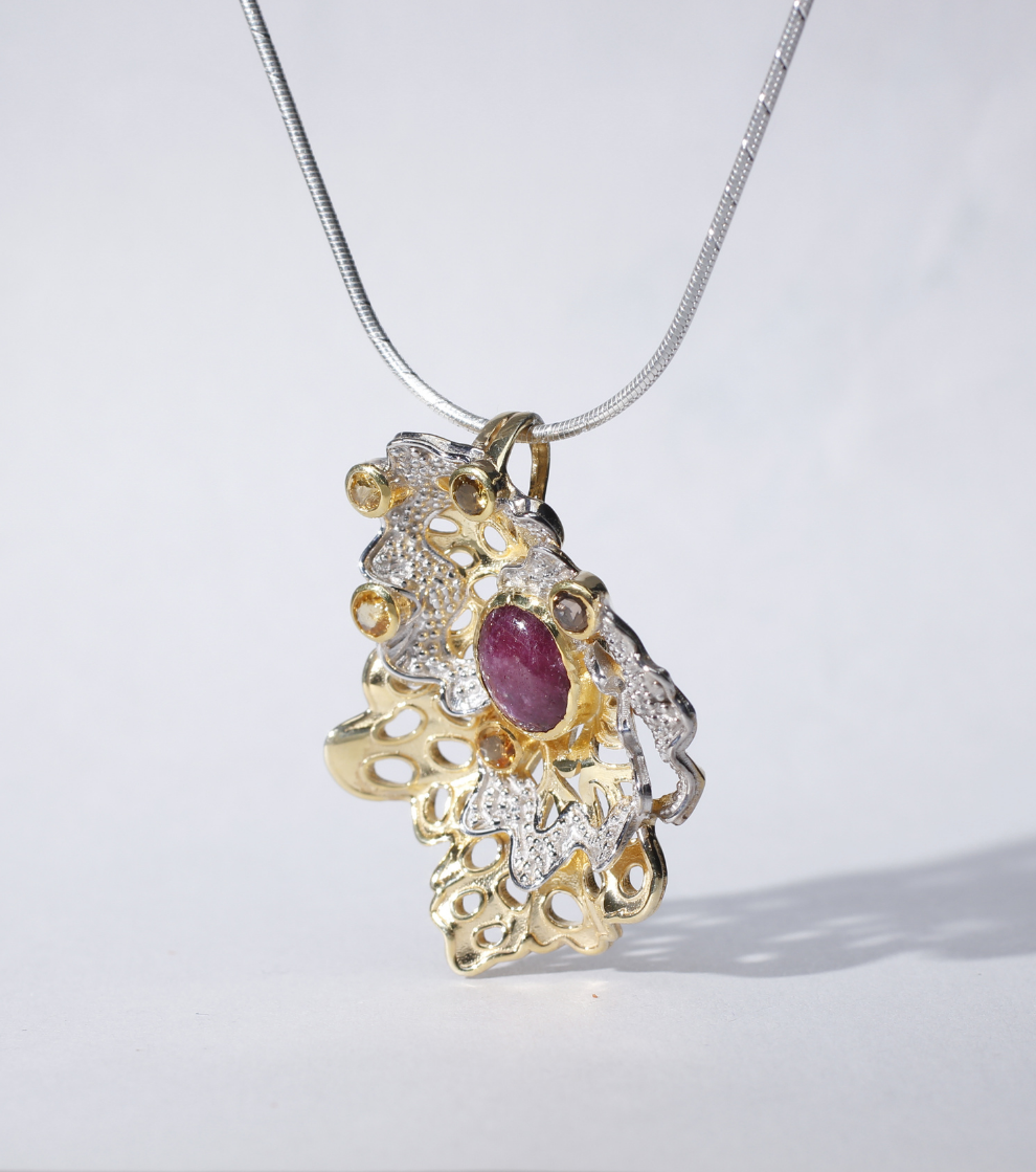 A luminous star ruby at the center symbolizes strength and the enduring spirit of the pansy flower. Surrounding it, yellow sapphires form delicate petals, representing the warmth and optimism that bloom from life’s challenges. This pendant is perfect for those who find inspiration in nature’s quiet strength, and pairs beautifully with deep purples, rich blues, or earthy tones, adding a touch of elegance to any outfit.