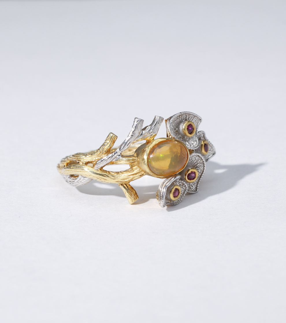 The honey tone opal at the center gives off a warm and inviting glow, while the bright rhodiumed peace lilies with tiny ruby spadixes form an exquisite and peculiar overlap. The golden stems reaching across the lilies create a striking contrast, offering two different perspectives to view this piece. This ring is perfect for pairing with both white and earthy toned clothing, making it a versatile and sophisticated accessory for any occasion. Elevate your style with this one-of-a-kind Peace Lily Ring.