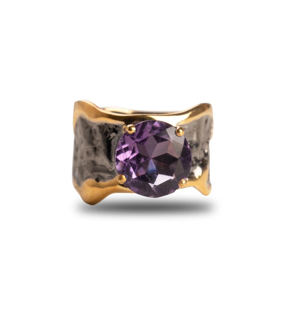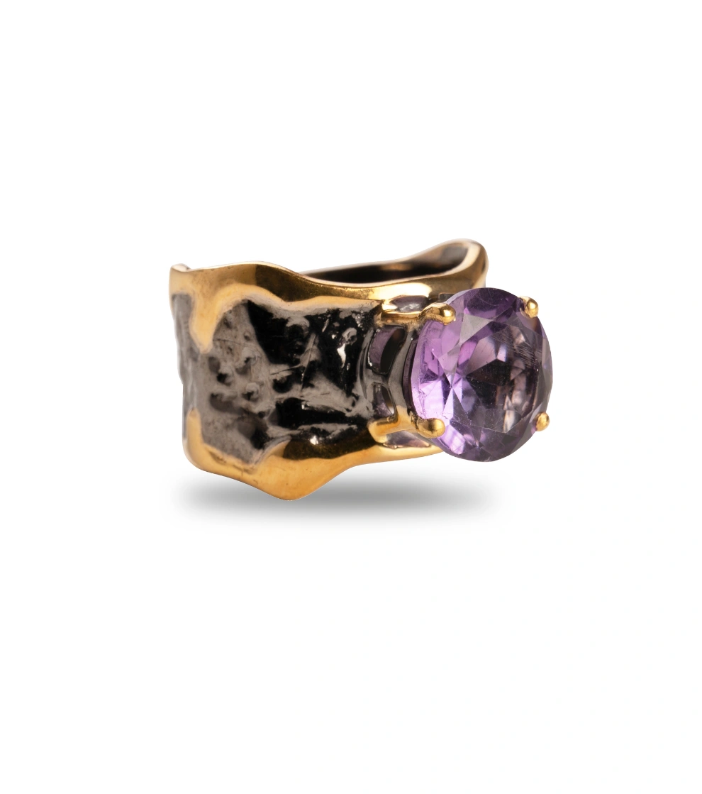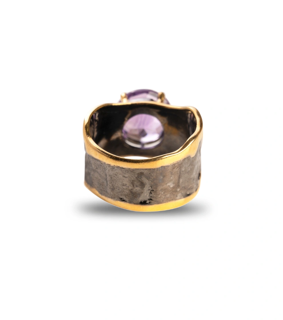 The ring’s design features a dramatic contrast, with the central section adorned in black rhodium plating, creating a shadowy, profound effect that enhances the amethyst’s radiant glow. Flanking this darkened core, the sides of the ring are elegantly plated in 18Kt gold rhodium, adding a touch of luxurious warmth and brightness.