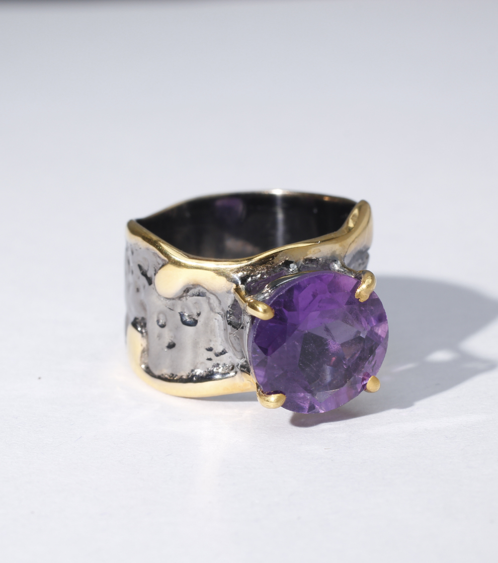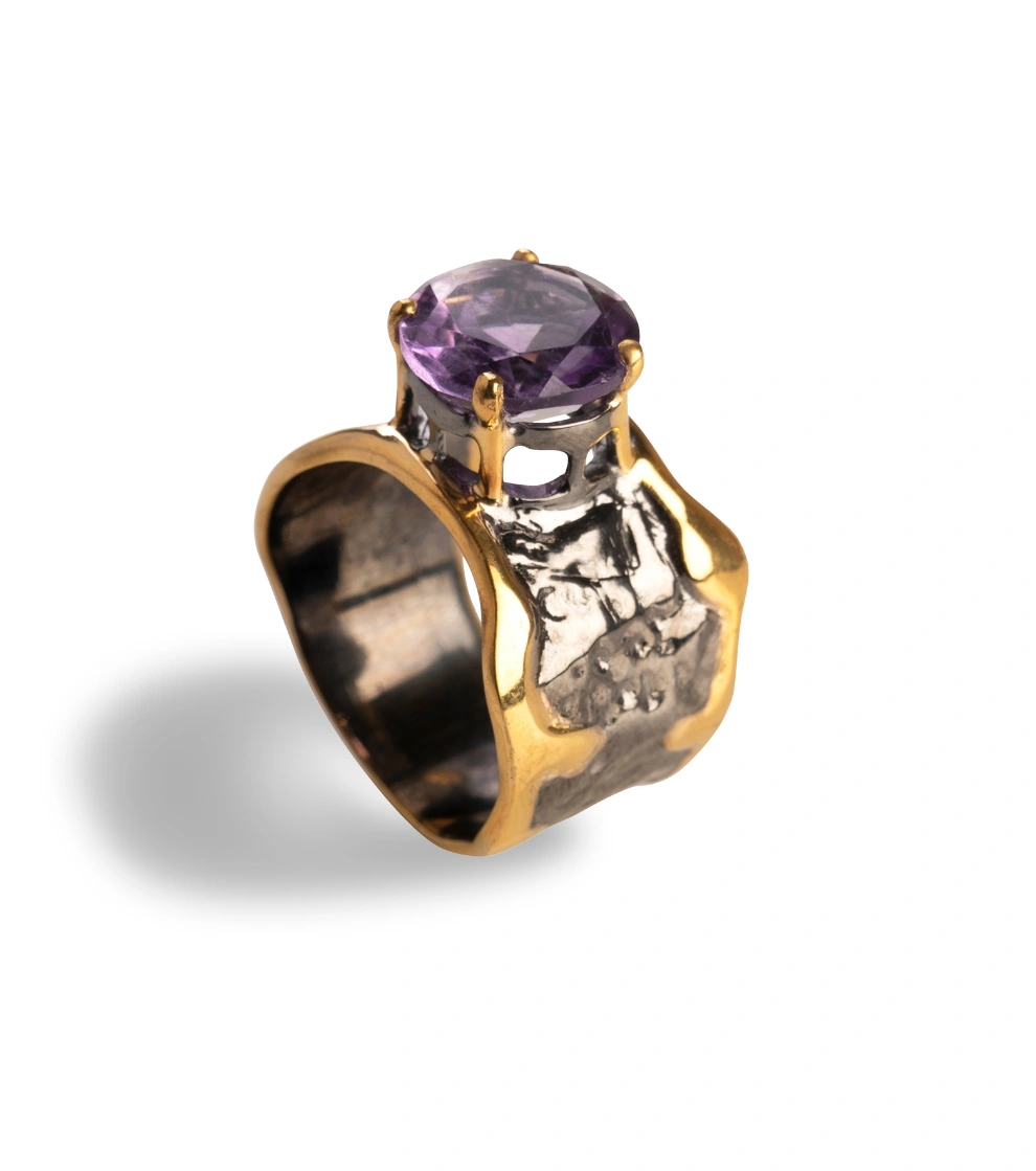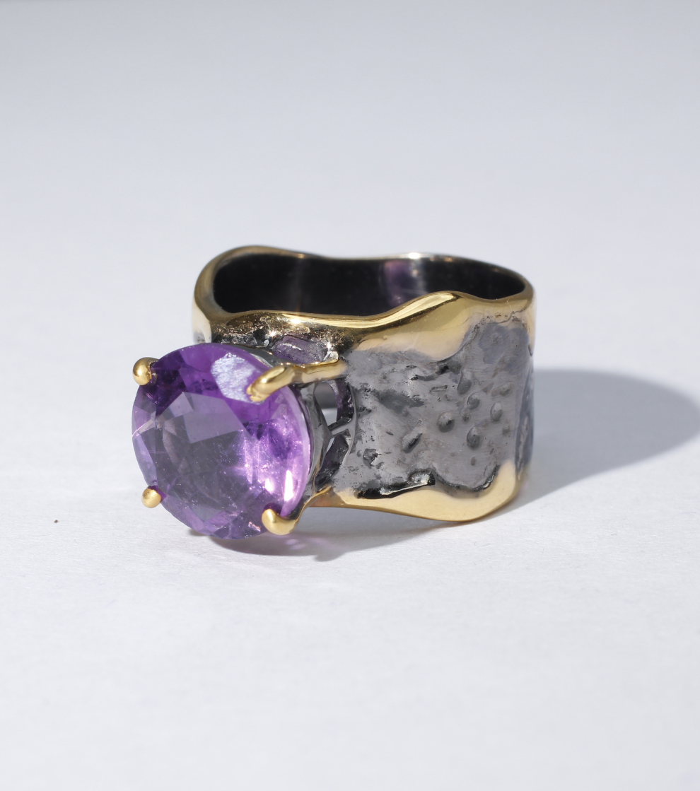 The ring’s design features a dramatic contrast, with the central section adorned in black rhodium plating, creating a shadowy, profound effect that enhances the amethyst’s radiant glow. Flanking this darkened core, the sides of the ring are elegantly plated in 18Kt gold rhodium, adding a touch of luxurious warmth and brightness.