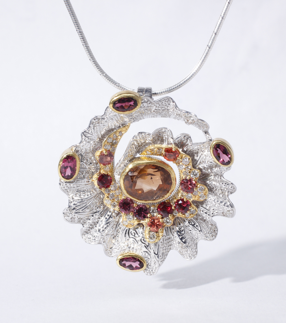 Embrace the Primordial Burst Pendant in Imperial Topaz. The  cosmic splendor of creation with the Universal Awakening Pendant. Featuring a radiant imperial topaz at its core, this pendant symbolizes the epicenter of the universe’s birth, while surrounding sapphires, tourmalines & simulated diamonds  represent the energy emanating from this primordial explosion. Perfect for those fascinated by the cosmos, it shines against dark colors like black and maroon, embodying the essence of stellar beginnings