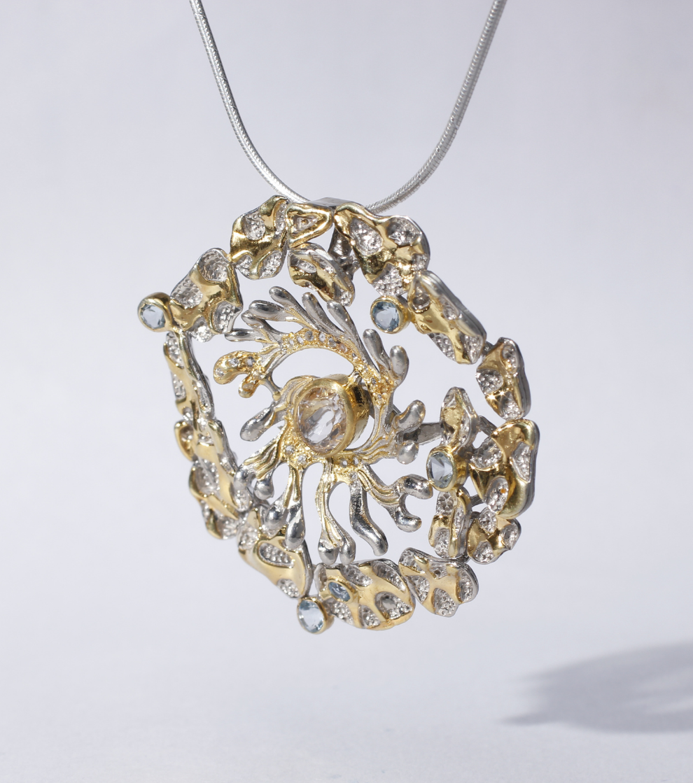 At its core, a deep aquamarine stone captures the swirling depths of a water cyclone, while smaller aquamarine stones surround it, mirroring the dynamic movement of the water cycle. The pendant’s thick, rounded border symbolizes the encircling force of water, adding a sense of fluidity and strength. Perfectly paired with flowing dresses in shades of blue, teal, or white, or with a sleek black evening gown, this pendant enhances outfits that evoke the tranquility and power of the sea, making it an ideal accessory for those drawn to the mysteries of the ocean.