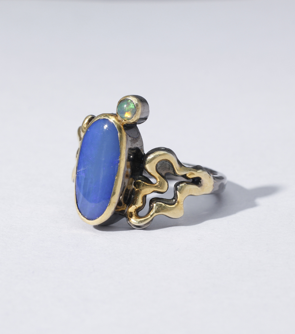 The Marine Garden Ring features a stunning combination of Australian and Ethiopian opals, creating a delicate deep sea show with rich blue and vivid hues. The black rhodium setting brings out golden highlights, resembling the scene of a marine garden. This ring brings the beauty of the sea to your hand, adding a touch of elegance to any outfit. Pair it with yellows, sea tones, and dark tones for a truly eye-catching look. Add a touch of oceanic enchantment to your collection with this limited 1 of 1 piece.